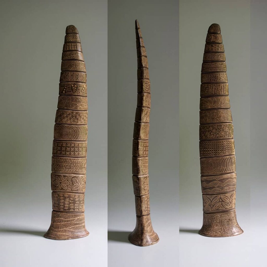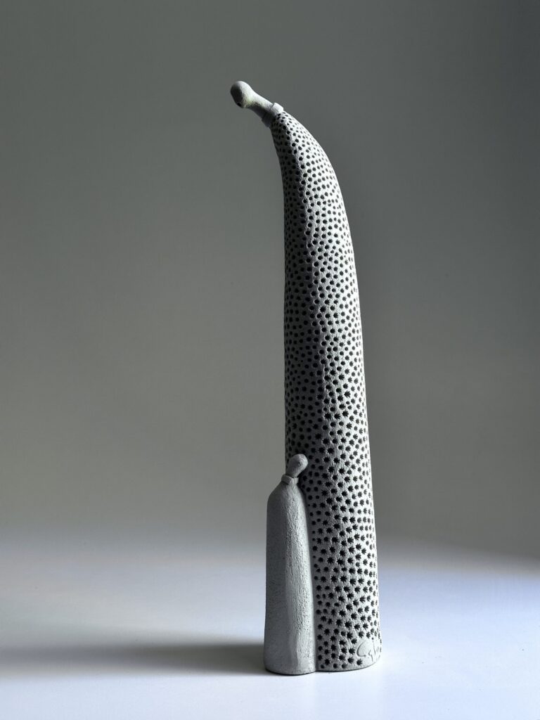 La aparente simplicidad orgánica de las formas de Cabo oculta un notable rigor técnico, esencial para sostener la esbeltez de sus piezas. Para conseguir la altura y la verticalidad, es probable que emplee técnicas de modelado por churro o rollos (coiling), o un vaciado posterior muy cuidadoso.