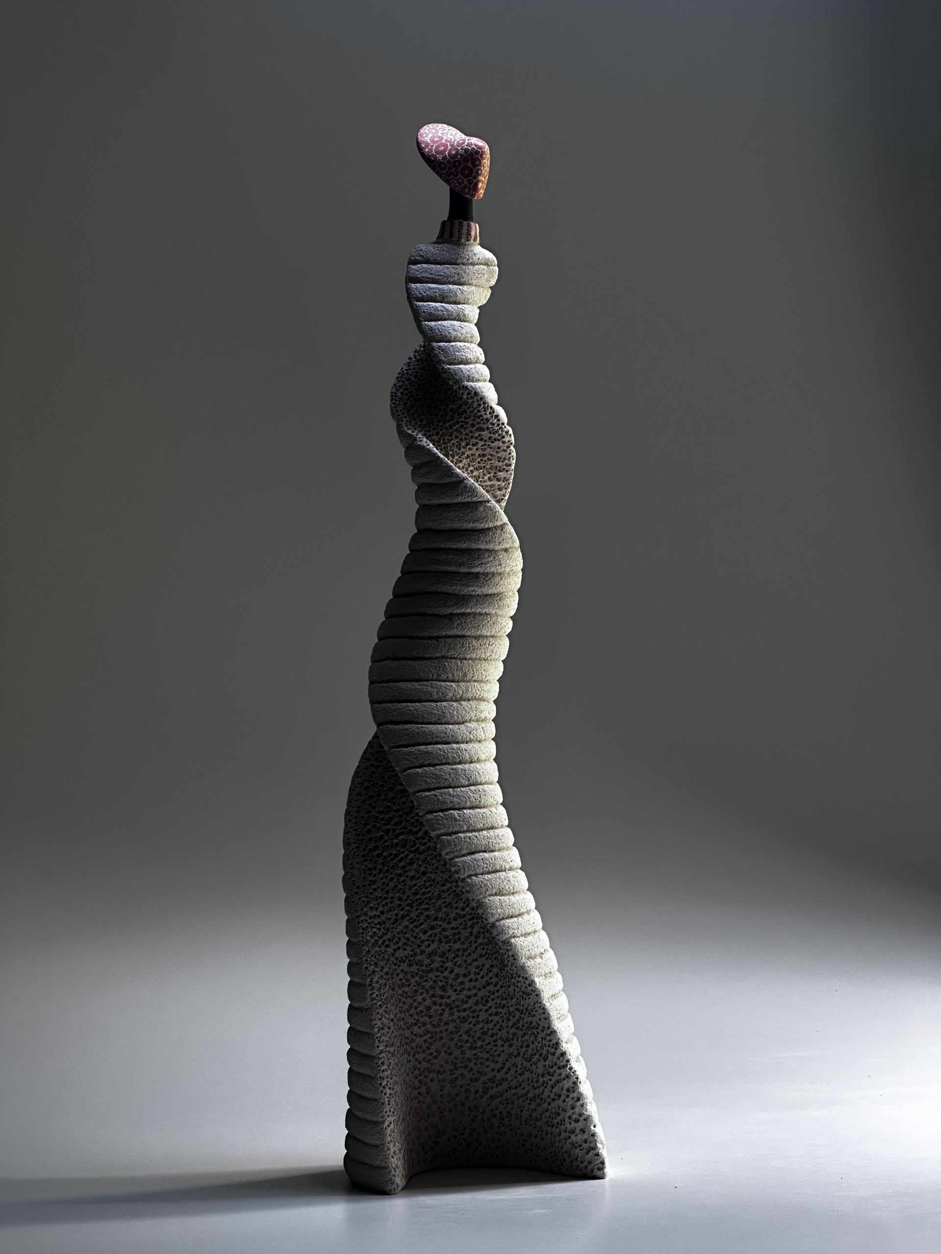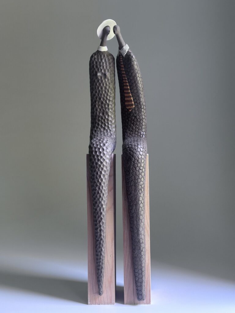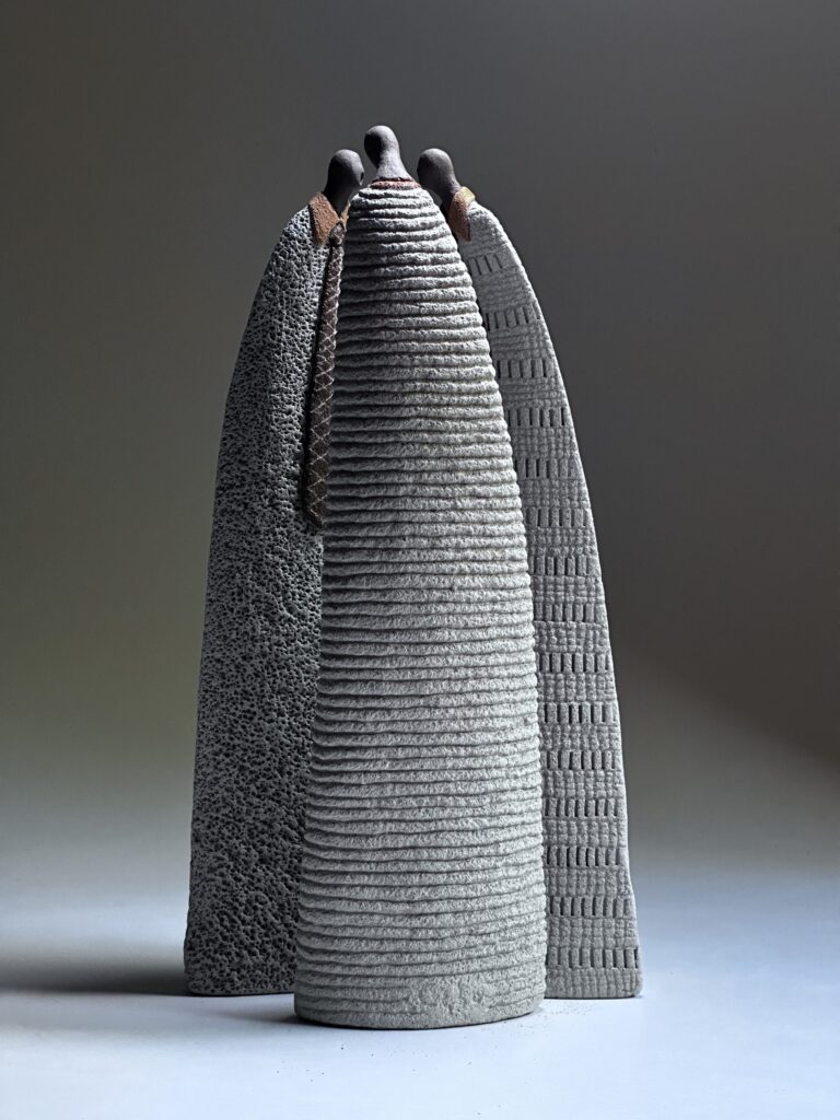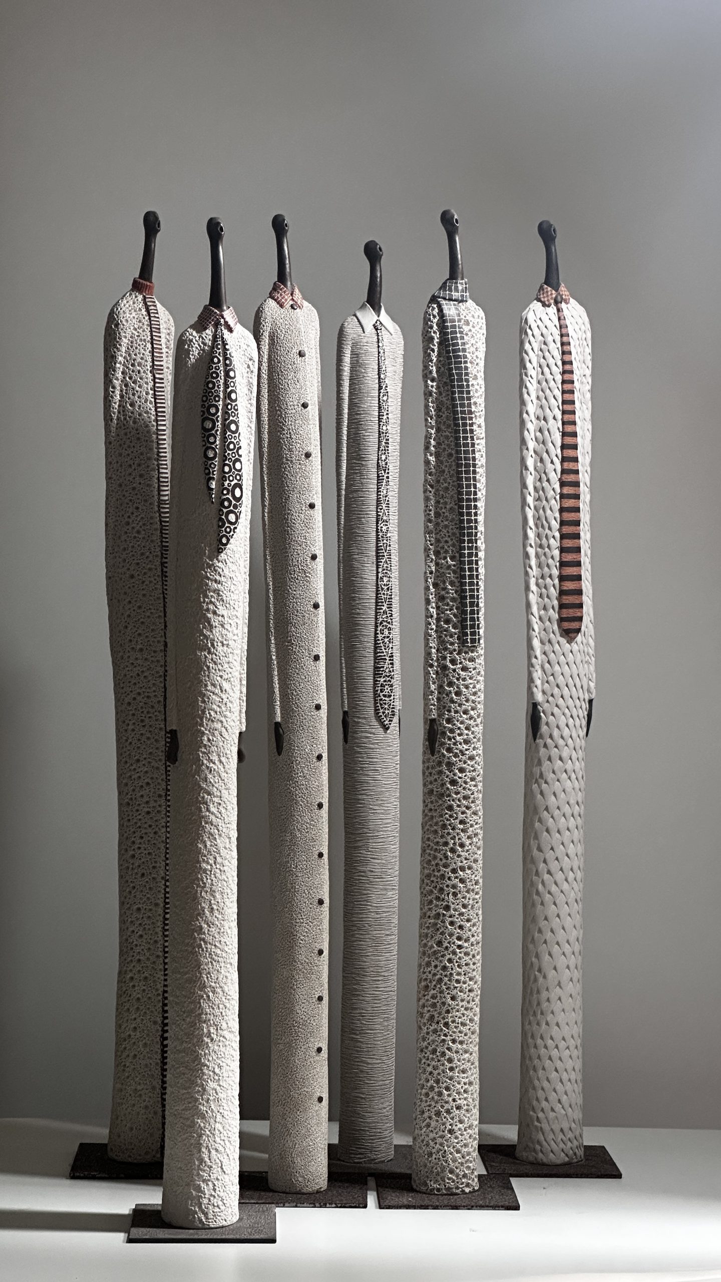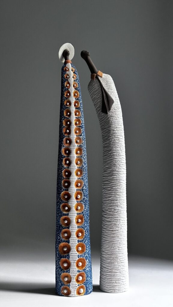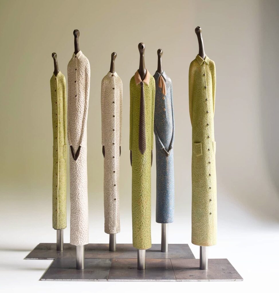 Esta serie es la más figurativa y se centra en la fragilidad y la fuerza interior del cuerpo. Crea tótems y figuras extremadamente alargados y estilizados, que reducen el cuerpo a su esqueleto formal, con pátinas terrosas y rugosas.