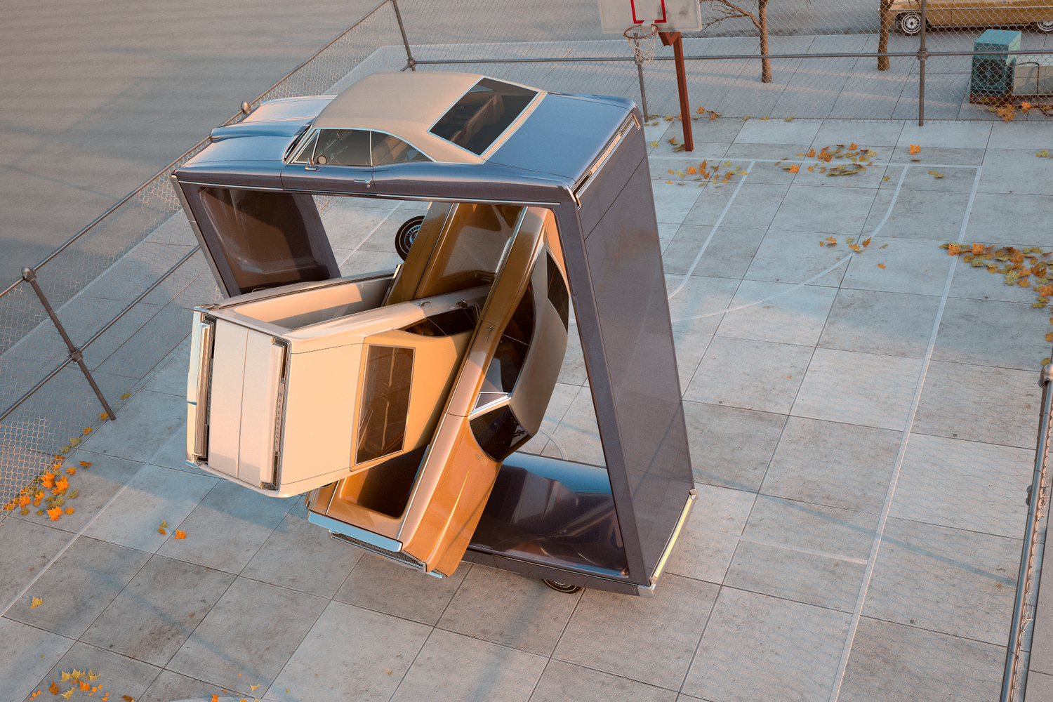 Vació el centro de los coches, estirando sus proporciones y creando montajes entre varios Pontiacs.