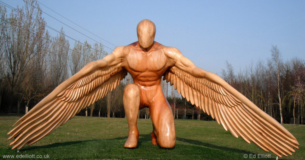 Sin duda su obra más reconocida. Tallada en madera de London Plane, la escultura representa una figura humana alada, agachada —una imagen de poder y vulnerabilidad al mismo tiempo. Su envergadura supera los 4 metros, lo que la convierte en una pieza monumental, pero su gesto mantiene una quietud meditativa. El encargo vino del National Trust para su exposición “Angel Garden” en la finca Mottisfont.