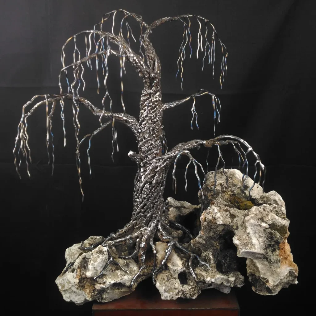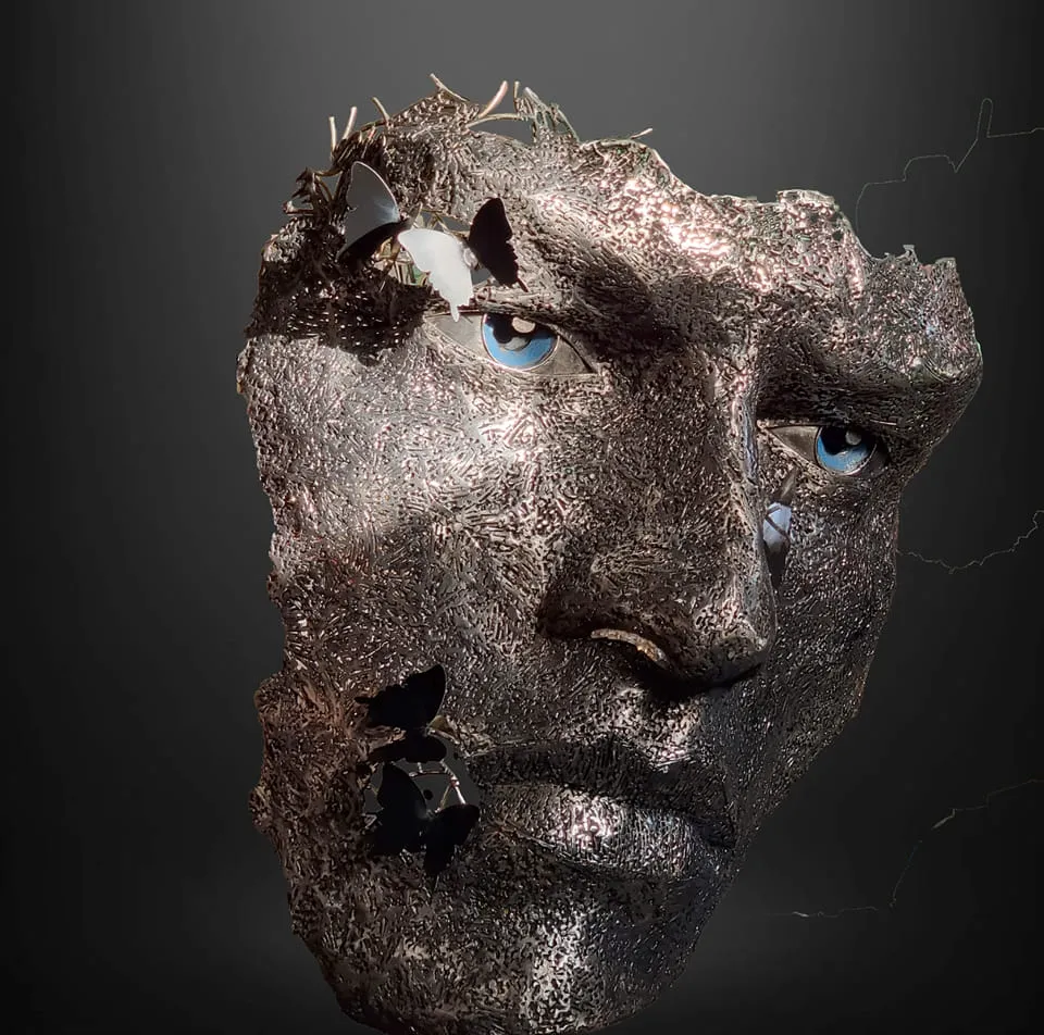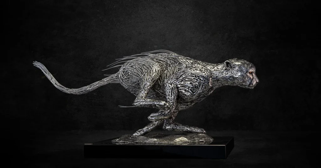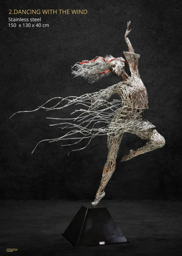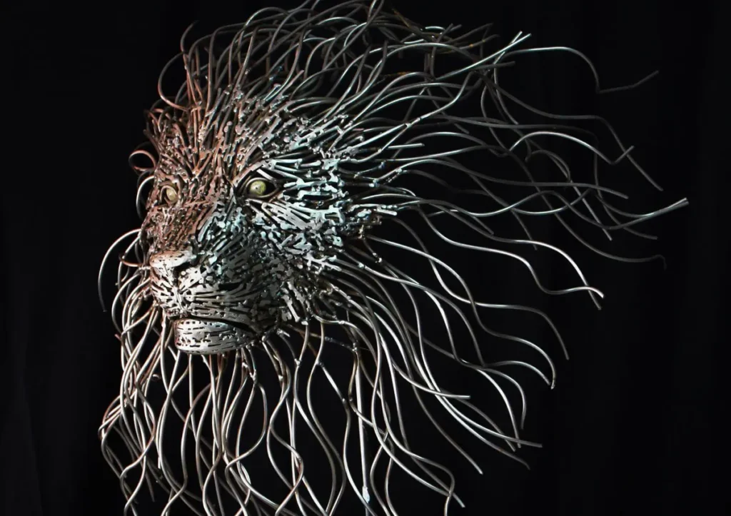 Es la capacidad de evocar fluidez y ligereza en algo tan pesado lo que distingue su estilo. Por ejemplo, en su obra «Never Give Up», una escultura que representa un rostro emergiendo de una maraña de acero, la tenacidad del metal se convierte en un símbolo de la lucha y la perseverancia humana. Cada soldadura y cada curva en el metal no son uniones forzadas, sino trazos de una narrativa visual que invita al espectador a contemplar la belleza en la imperfección y la fuerza en la fragilidad.