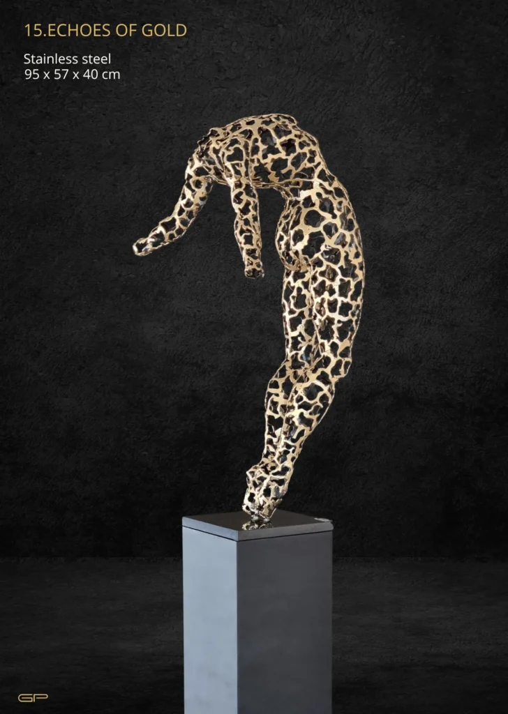 La obra de Georgie Poulariani es un diálogo continuo entre la naturaleza y las emociones humanas, sus dos principales fuentes de inspiración. No se trata de una simple imitación de formas naturales, sino de una fusión poética entre el mundo orgánico y la psique humana. Sus esculturas capturan la esencia de la naturaleza: la fluidez de una ola, la ramificación de un árbol o la gracia de un animal en movimiento. Pero en cada una de estas formas se esconde una narrativa emocional. El metal que se curva como el tronco de un árbol puede evocar la resiliencia y el crecimiento. Una espiral de acero que imita el movimiento del agua podría simbolizar la esperanza o el flujo constante de la vida.