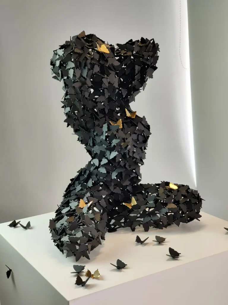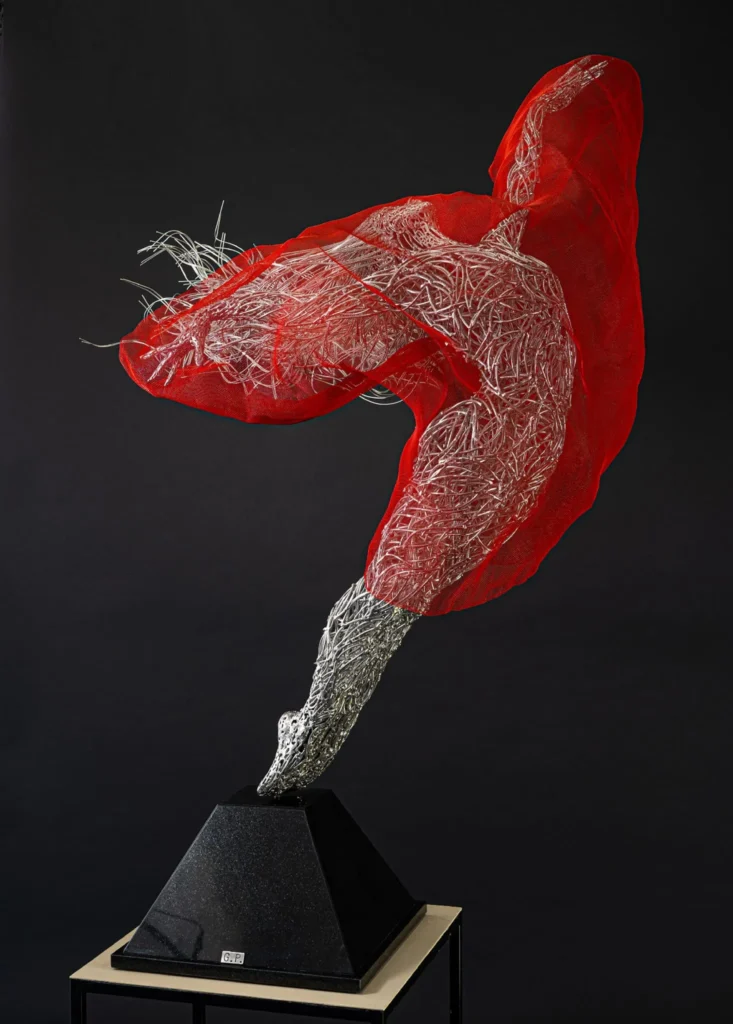 El lenguaje artístico de Georgie Poulariani es el acero, un material que en sus manos se transforma de desecho industrial a lienzo de emociones. Su proceso creativo comienza con la recolección de restos de metal, a los que él se refiere como su «materia prima». Este enfoque sostenible no es solo una elección estética, sino una filosofía que permea toda su obra: dar una segunda oportunidad a lo que ha sido descartado. A través de soldaduras precisas y un meticuloso trabajo de detalle, Poulariani logra una alquimia fascinante, haciendo que el material rígido y frío parezca flexible y lleno de vida. Sus esculturas son una dicotomía: robustas y poderosas por su materialidad, pero a la vez delicadas y llenas de movimiento.