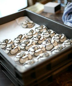 Entonces comienza el trabajo del colorista, el enfriamiento de los pétalos con mezclas de tinte,  fórmula exclusiva de La Maison, para obtener tonos de color, con toque sutil y delicado realizado brocha a  brocha.  «La Alta Costura» a veces requiere colores muy audaces.